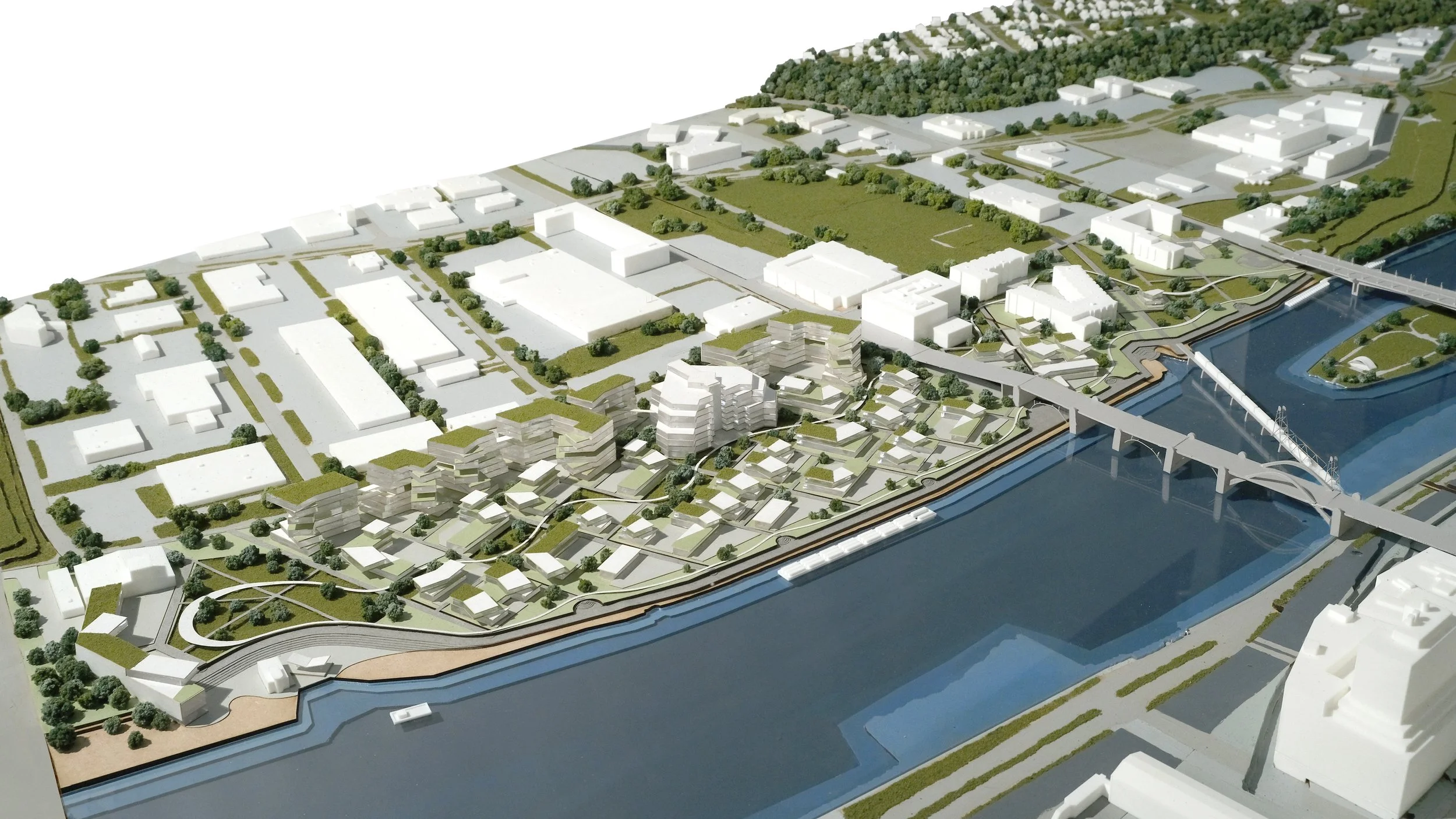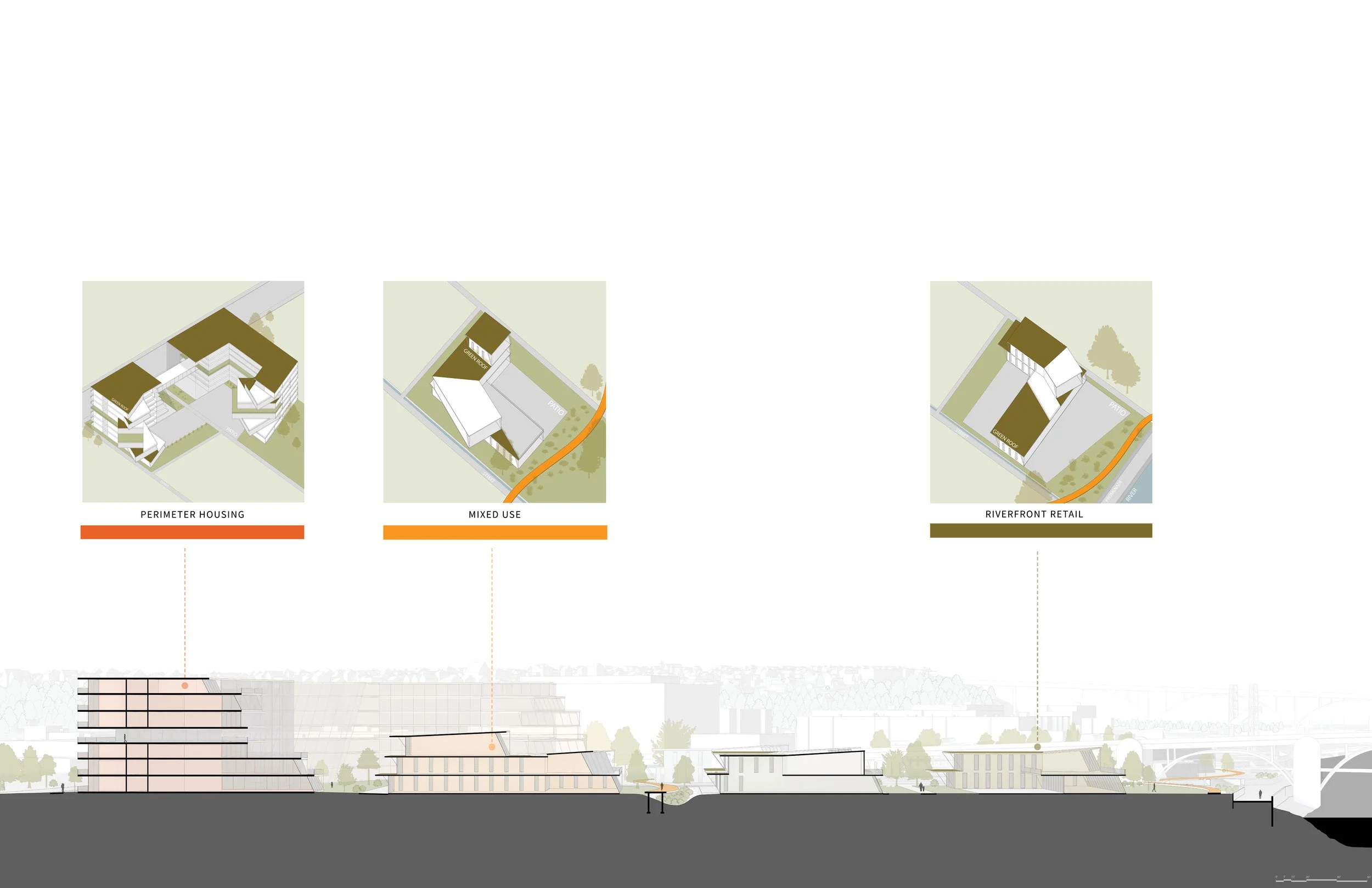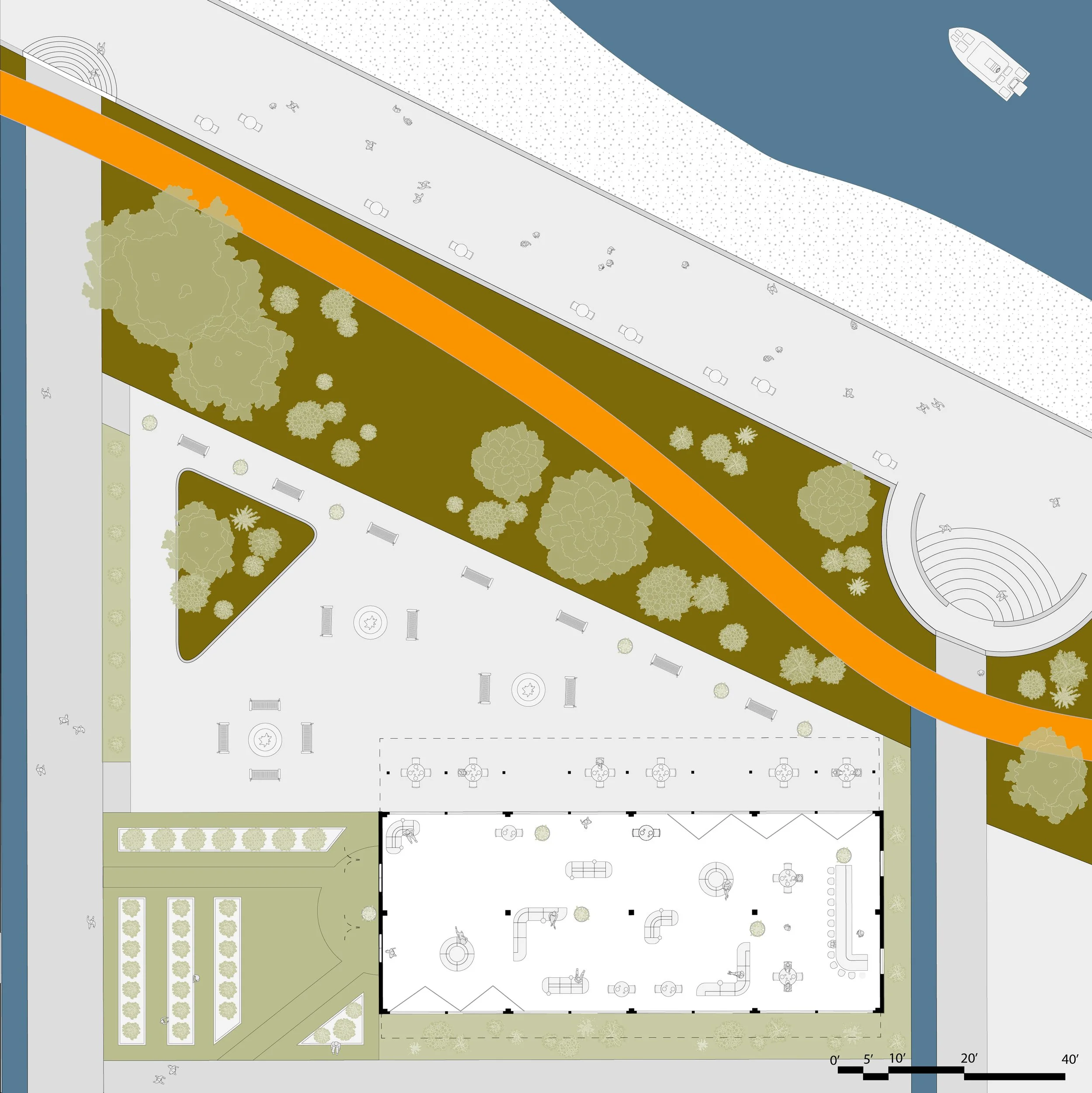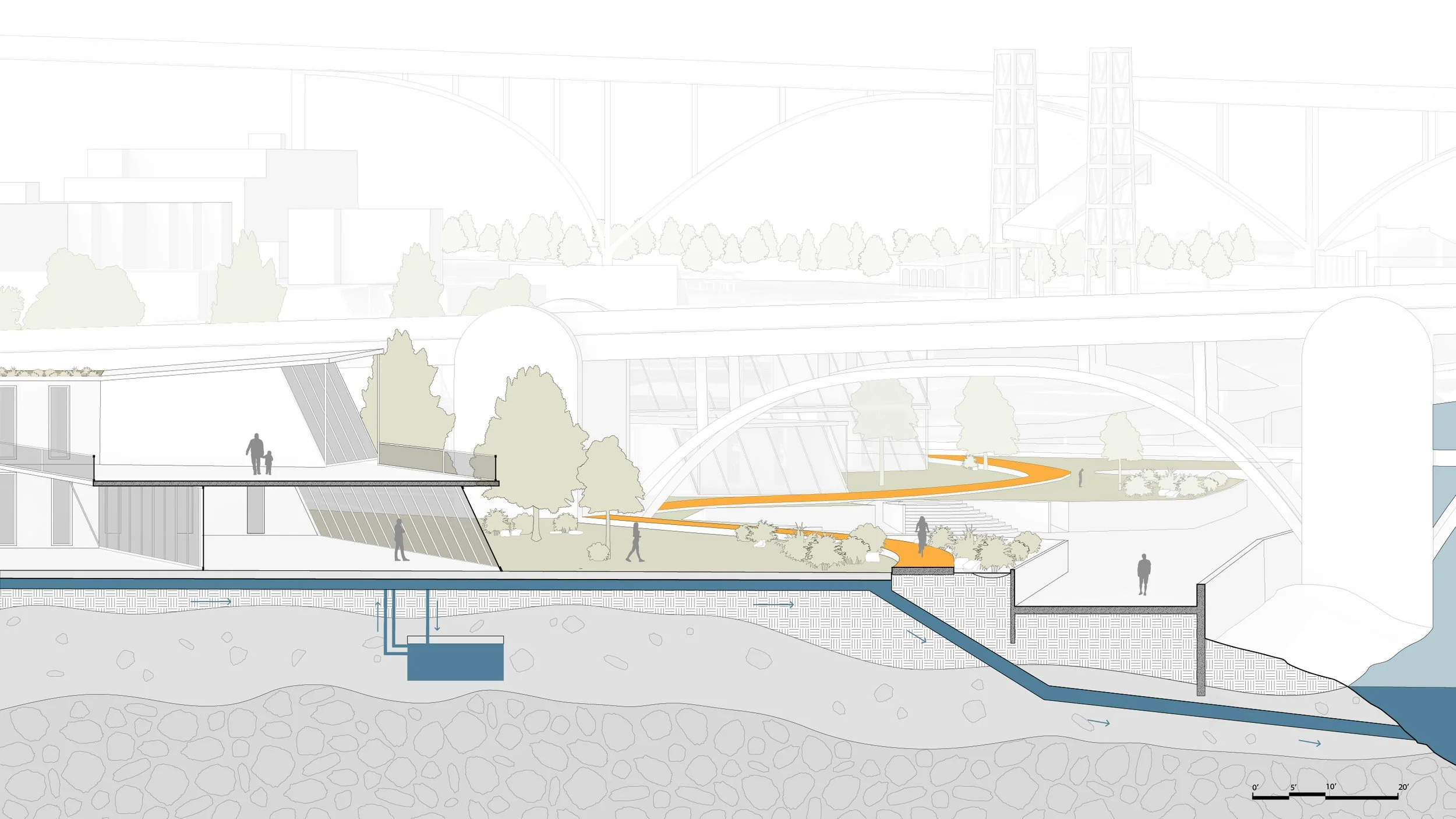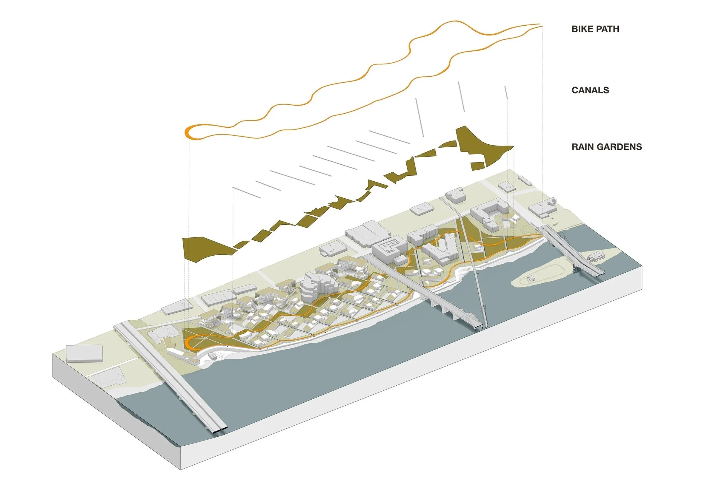 Responding to the industrial sprawl of the West Side Flats, this urban design proposal intertwines riverfront ecologies with social infrastructure to create a regenerative community hub. The design uses a ādrop of waterā concept to shape a looped circulatory system, featuring rain gardens and a floodable plaza that manage water flow while inviting public interaction. Ultimately, the project functions as both habitat and destination, restoring the siteās vibrancy and establishing a permeable, biophilic connection to the Mississippi.